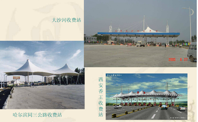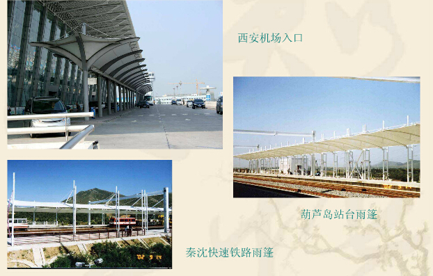 在我國(guó)隨著PTFE永久性膜材加工工藝的突破,也逐步為設(shè)計(jì)師們所應(yīng)用,如廣州白云機(jī)場(chǎng)候機(jī)大廳、西安機(jī)場(chǎng)入口、秦沈快速鐵路、葫蘆島站臺(tái)雨棚等等。此外,膜結(jié)構(gòu)在交通設(shè)施方面的應(yīng)用還包括加油站和公路收費(fèi)站雨篷,大部分采用PVC涂層材料。建設(shè)火車站候車室及候機(jī)大廳一定要使用PTFE材料(永久性膜材),而建設(shè)公路收費(fèi)站雨篷使用PVDF自潔性能較好的材料。