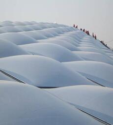 一談到幕墻,大家首先想到的是玻璃,鋁合金,石材等各種硬質(zhì)材料的建筑幕墻應(yīng)用形式。而柔性膜結(jié)構(gòu)幕墻的應(yīng)用依賴于膜結(jié)構(gòu)及膜材的技術(shù)創(chuàng)新和發(fā)展,從歷史上來看,材料技術(shù)的累積為建筑學(xué)帶來越來越多的創(chuàng)意。