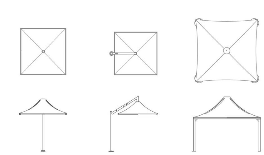 我們有各種各樣的選擇讓自己在不妨礙或限制生活區(qū)域的情況下為外部空間遮陽(yáng)。正方形、長(zhǎng)方形、六角形或八角形的傘狀結(jié)構(gòu)——都有一個(gè)支撐點(diǎn)——通過(guò)連接不同的裝置并使支撐的柱子保持距離,可以有效地覆蓋大片區(qū)域。