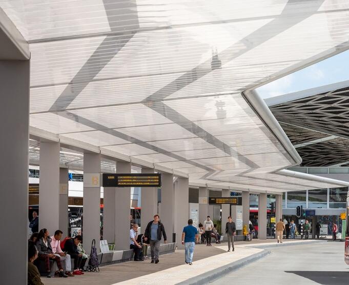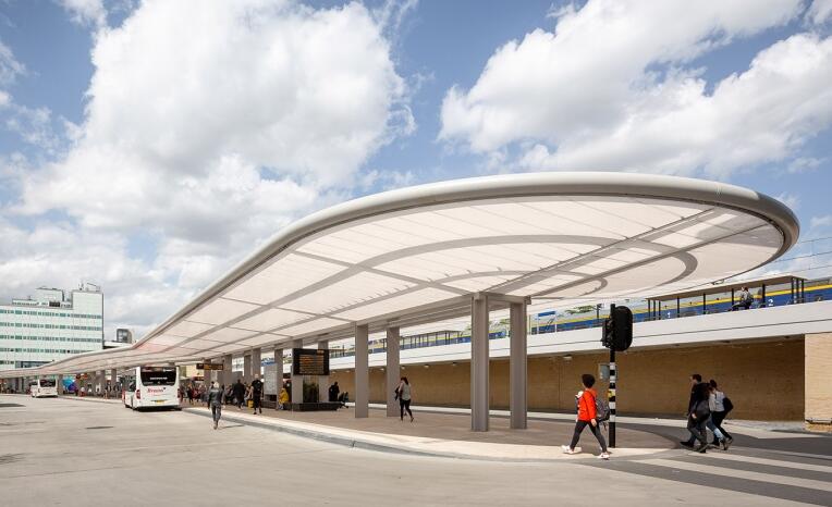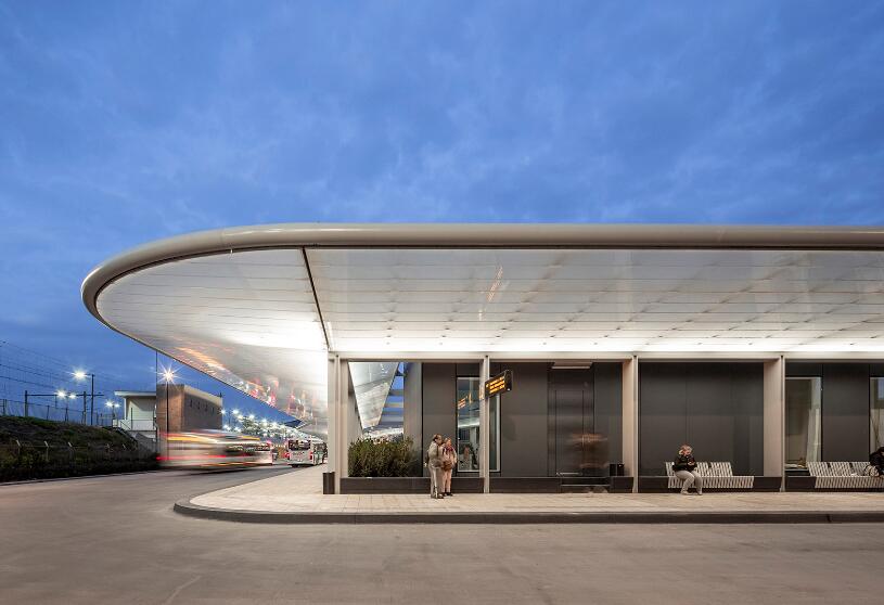 車站由一系列非常薄的柱子組成,頂部是一個簡約的遮陽蓬結構,形成了中心開放,長度超過160米的三角形流線。汽車??奎c沿著外側布置,共有6個上車點1個下車點。遮陽篷結構總體寬度為14到30米,結構功能齊全與城市環(huán)境相協(xié)調,寬闊的遮陽蓬結構完全覆蓋了整個公共汽車站臺和停靠汽車的一部分,因此旅客可以完全在遮陽避雨的情況下上下車。