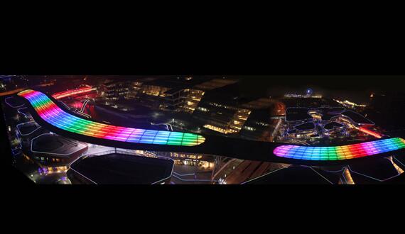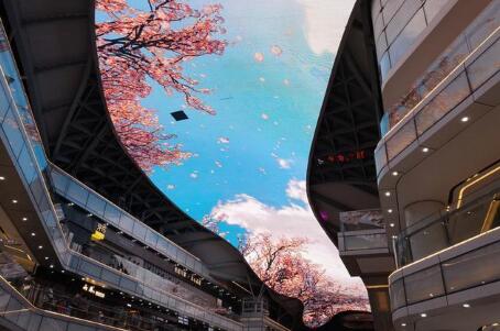 通過(guò)天幕屏,將人帶進(jìn)奇思妙想的光影世界。吊裝在天花頂上的大型LED天幕屏宛如一條色彩艷麗的綢緞、明亮深邃的天空,再配合以新型LED燈條、燈帶、投影等照明設(shè)備,起到亮化、渲染作用。