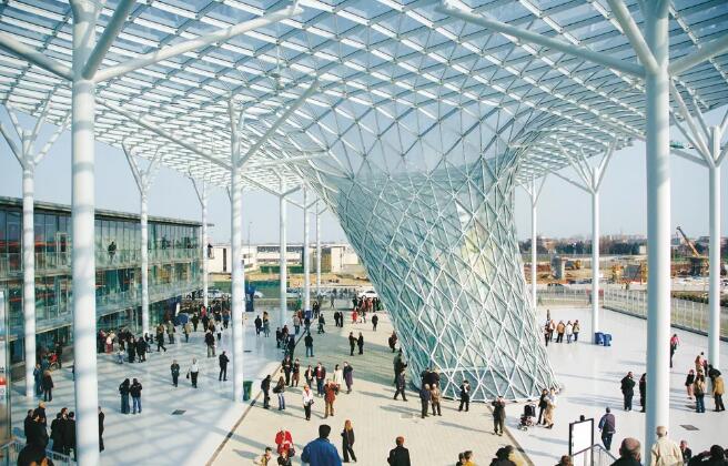 以上各種天幕結構均是支承在周邊建筑或樹形上的。除此以外,還有一種以天幕網(wǎng)格獨立或相對獨立支承的結構,其建筑形態(tài)往往呈現(xiàn)“喇叭形”。
