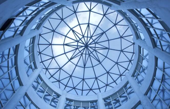 規(guī)則曲面的天幕一般采用鋼結構網(wǎng)殼形式,利用網(wǎng)殼曲面的形抗原理,結構以軸向受力為主、效率高,以較小的截面尺寸即可實現(xiàn)很大跨度。這一類網(wǎng)殼曲面多為圓柱面、球面。