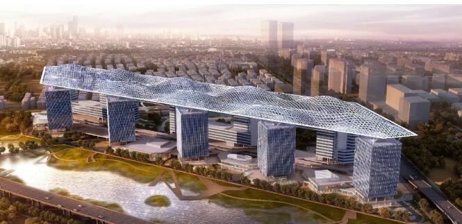 “云廊”平面尺寸長約730米、寬120米,波峰到波谷最大矢高16米。通過Y形外伸斜柱整體支承于由11棟間距50-100米的塔樓建筑群頂部,實現(xiàn)“如浮云一般連綿起伏”的形象,是一個超長、大跨的單層網(wǎng)格結構。