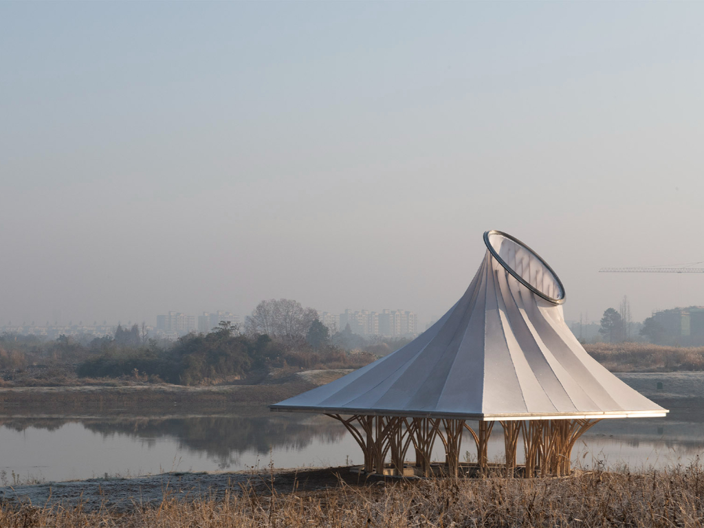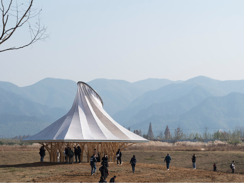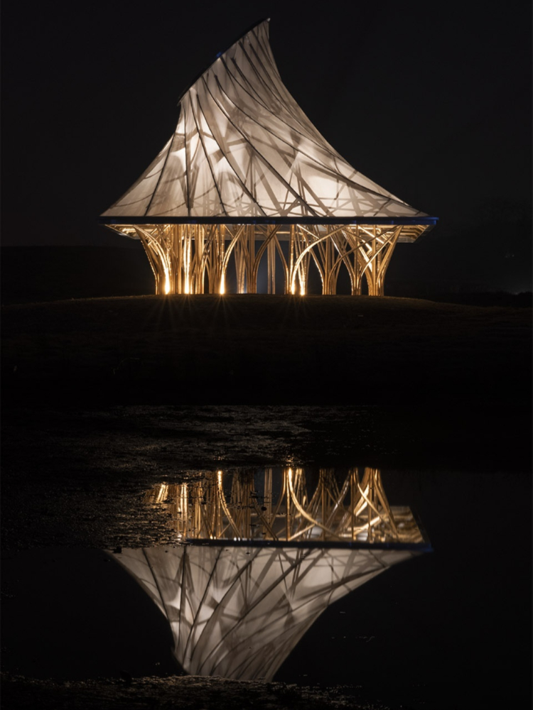 建筑的形式是根據(jù)環(huán)境精心定制的,這個(gè)裝置位于一個(gè)小島上,四面環(huán)繞著水與群山的景色。劇院下部結(jié)構(gòu)由竹子組成,竹子排列錯(cuò)落有致,頂部采用白色膜材覆蓋,木結(jié)構(gòu)與膜結(jié)構(gòu)碰撞,提供了一種不同的空間體驗(yàn)。