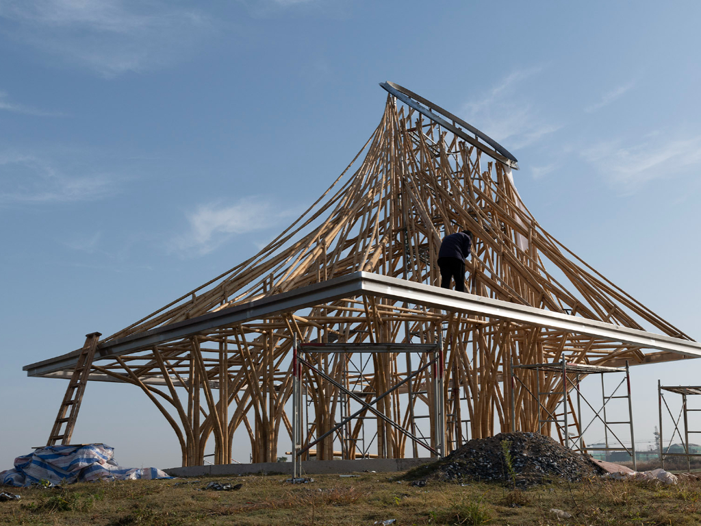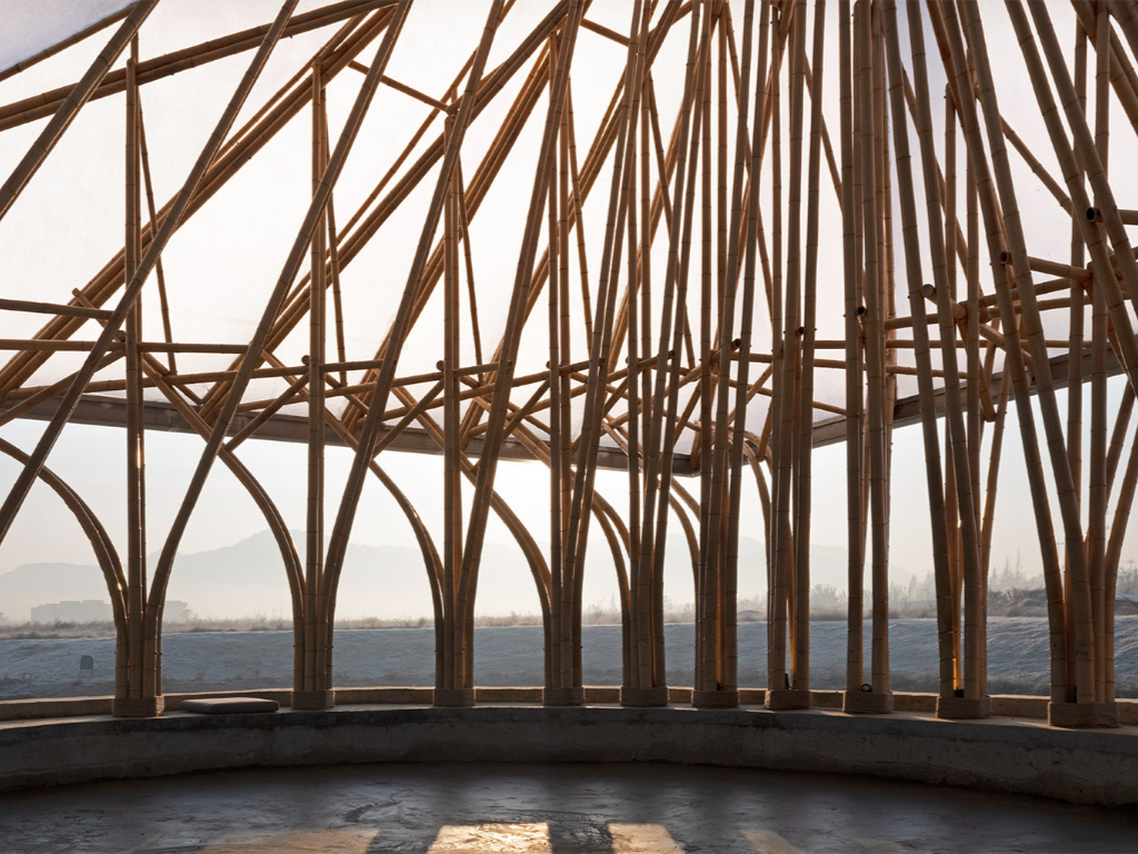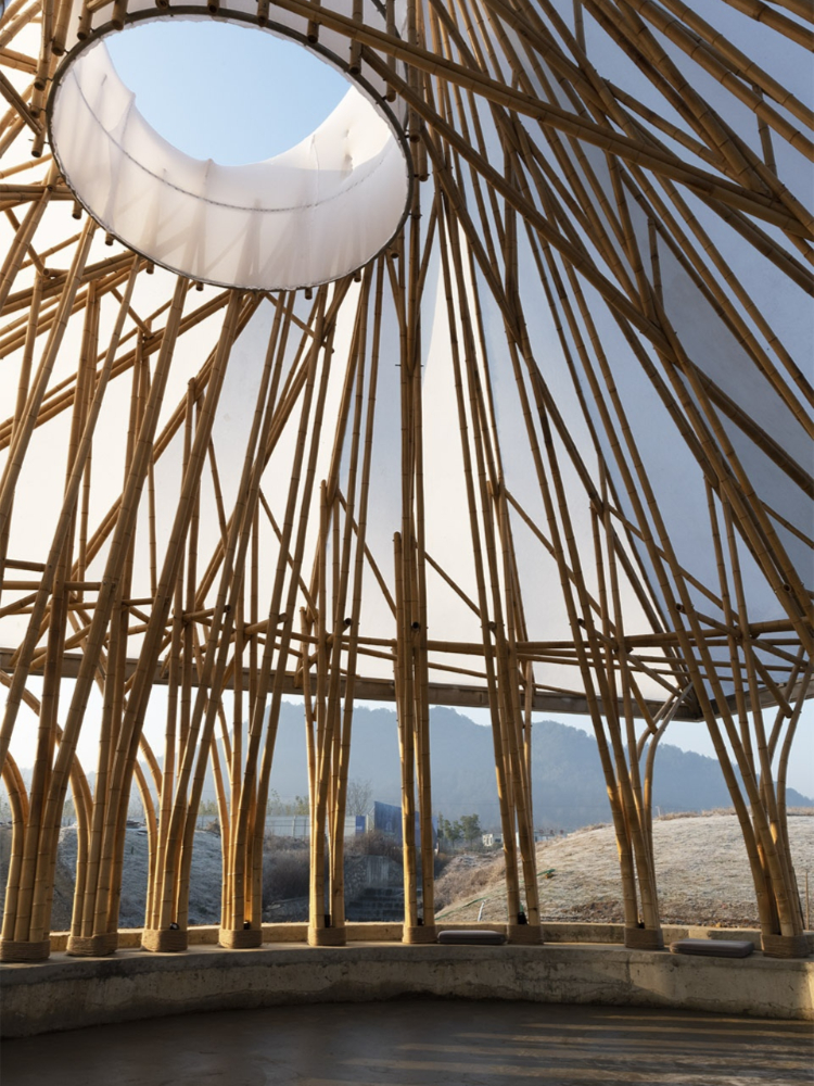 當(dāng)然,在制作過程中,圓孔處的鋼環(huán),屋檐處的方形鋼架,以及嵌入結(jié)構(gòu)底部混凝土基礎(chǔ)中的板材等一系列不同構(gòu)件都不可忽略。這些構(gòu)件提供了框架與模板,才能完美地連接起每一根竹子。