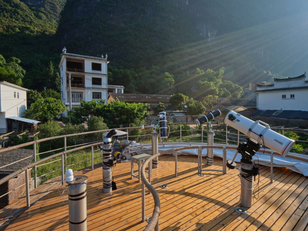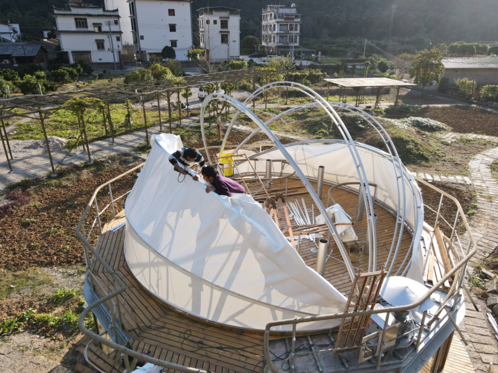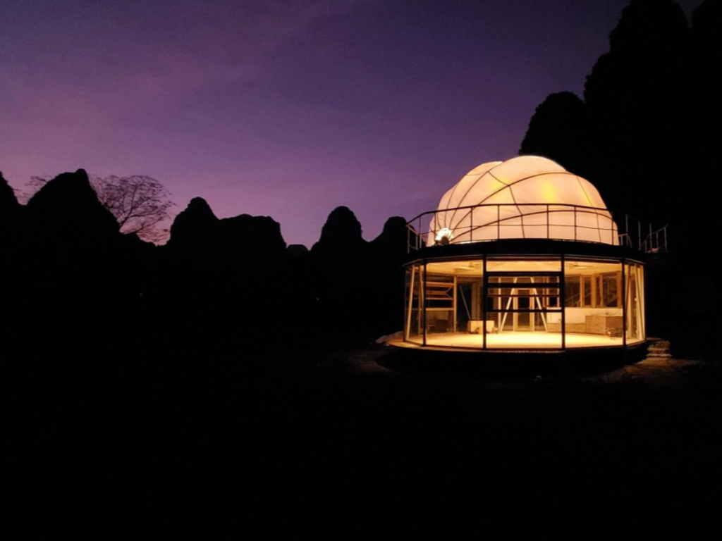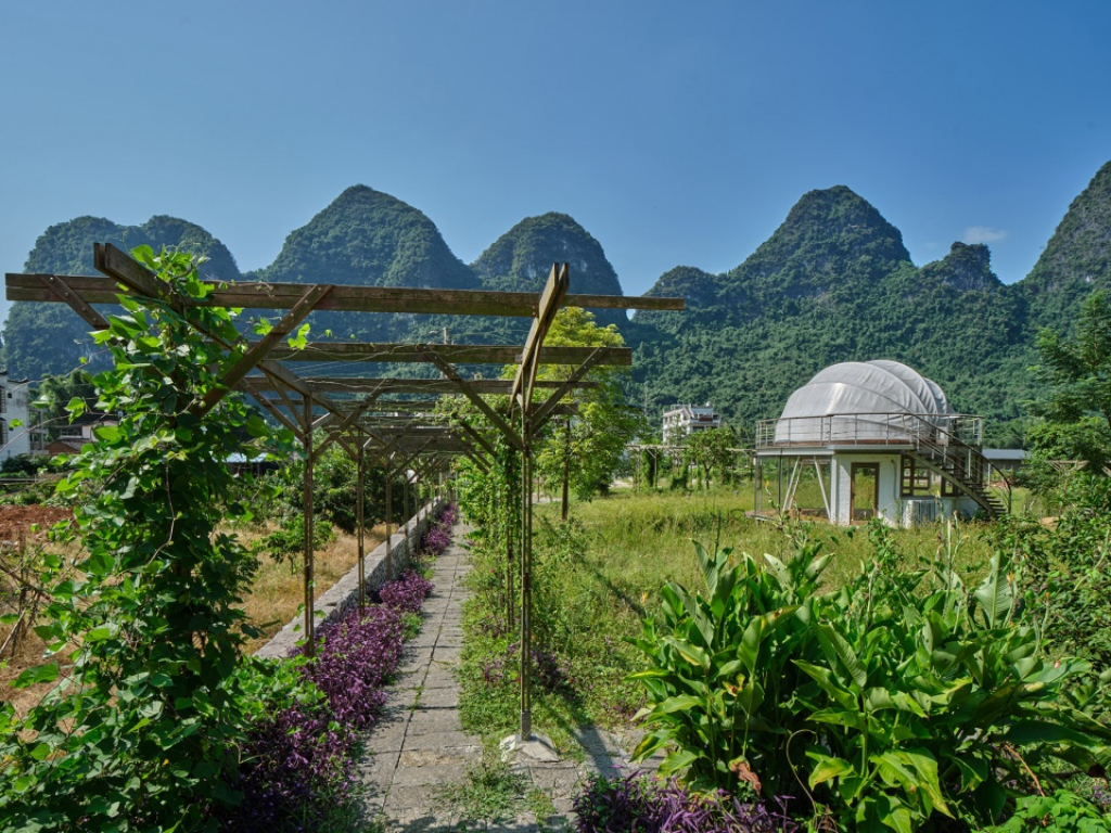 二層的透光膜頂在夜間透出柔和暖光,仿佛在漓江田園間點(diǎn)起一盞球形燈籠,為喀斯特村舍更添一絲奇幻趣味。