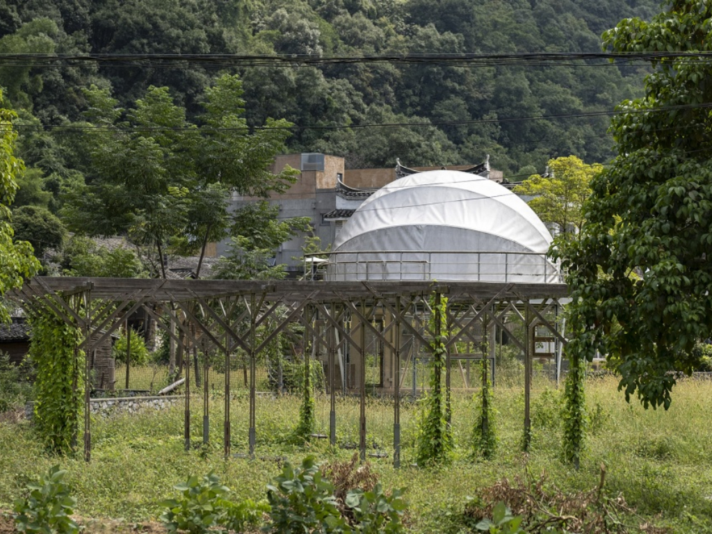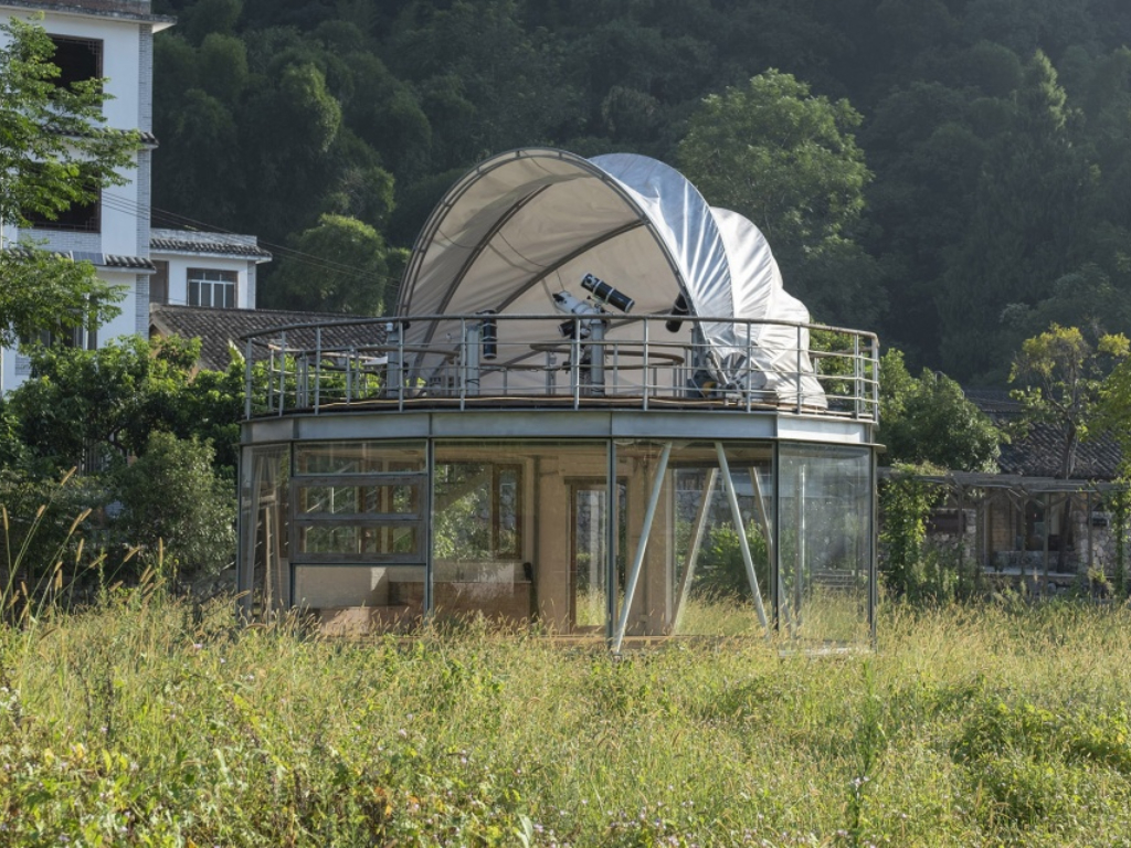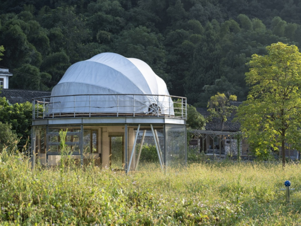 建筑主體分為上下兩個(gè)可獨(dú)立運(yùn)作的空間:一層的十二邊形平面為以輕鋼構(gòu)和玻璃圍合成的室內(nèi)服務(wù)空間;二層的直徑6.6米半球膜結(jié)構(gòu)則為室外星象觀測(cè)平臺(tái)提供可開閉式的遮蔽空間。