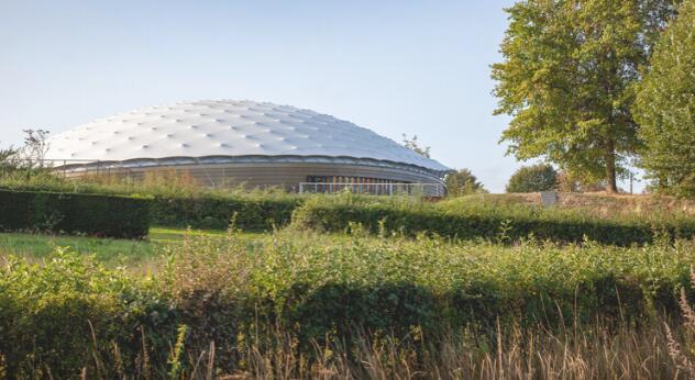 赫魯斯貝克 Shaded Dome 的外形是一個(gè)被拉長(zhǎng)的穹頂,由輕型織物構(gòu)成,隱喻在市場(chǎng)花園行動(dòng)中布滿天空的降落傘。建筑坐落在一個(gè)平坦的山頂上,略微向山谷傾斜,同時(shí)在該方向上削減體量,形成醒目的入口空間。辦公室和倉(cāng)庫(kù)位于地下,上部空間留給餐廳,在這里可以遠(yuǎn)眺山谷——當(dāng)年盟軍各師就是從這里開始向德國(guó)進(jìn)發(fā)。