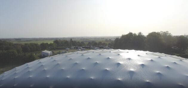 當(dāng)屋頂充氣時(shí),自動(dòng)對(duì)準(zhǔn)的撐桿就會(huì)豎起來,在它們之間形成一個(gè)空腔,加快空氣流通,并自然而然帶走太陽輻射產(chǎn)生的熱量。相比于傳統(tǒng)膜結(jié)構(gòu),Shaded Dome 這種雙層織物加 50 厘米空腔的結(jié)構(gòu),能夠用更少的能耗創(chuàng)造健康舒適的室內(nèi)環(huán)境。