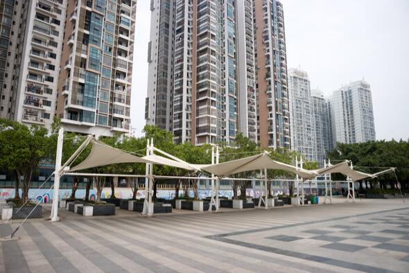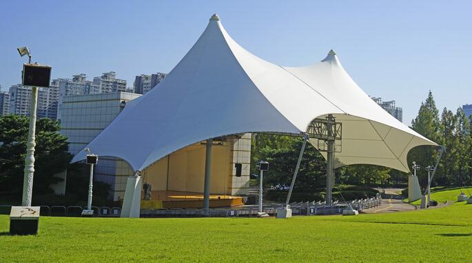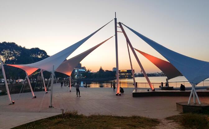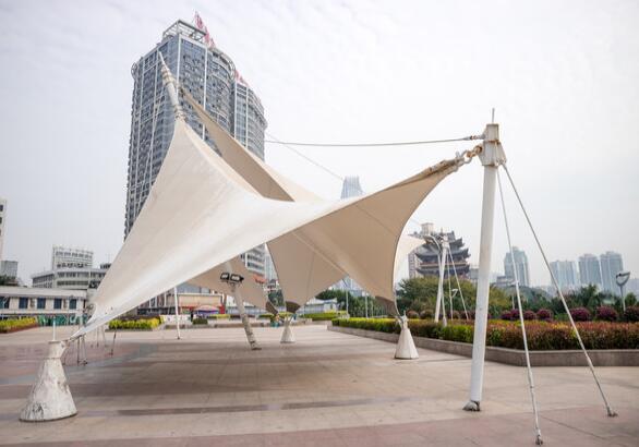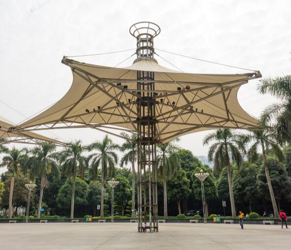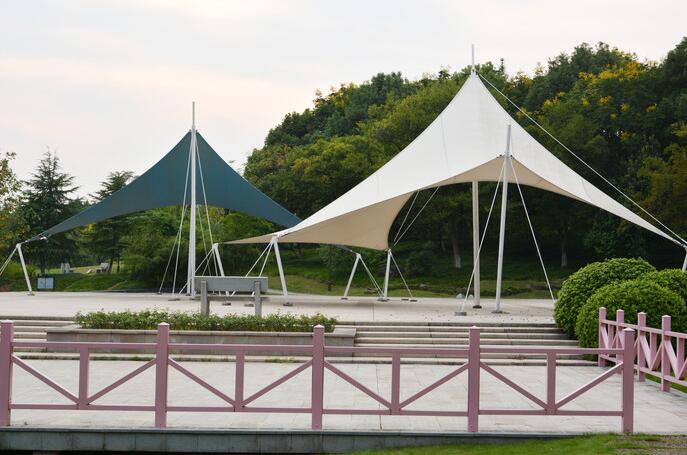 膜結構主要由膜材、鋼索及支柱組成,通過鋼索的抻拉作用使膜材形成張力,以達到固定的結構形式。它以各種自由、輕巧、柔美,充滿力量感的造型,成為園林或景觀裝置的重要組成部分之一。
