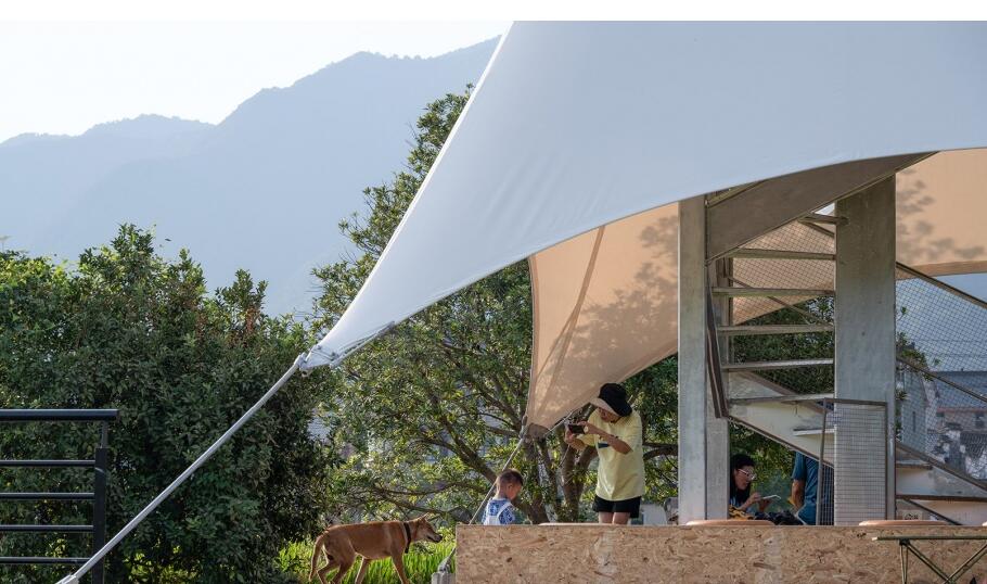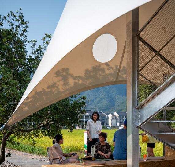 這個(gè)亭子可以是一座眺望塔,在村口遠(yuǎn)遠(yuǎn)就能看到它,但又不是太突兀,它也可以是一個(gè)大帳篷,有趣、輕盈地落在稻田中央,帳篷之下是人們相聚的場所。帳篷上還有四個(gè)透明膜小圓洞,處在不同的高度,面向四個(gè)方向。