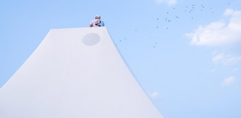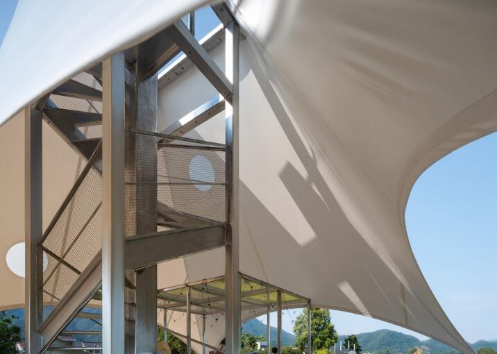 設(shè)計(jì)方于是設(shè)想了一種快速搭建的輕型結(jié)構(gòu):塔(樓梯)在中間和架在水池上的操作空間形成一個(gè)鋼結(jié)構(gòu)的整體,樁基打到池底以下的持力層,形成穩(wěn)定的核心結(jié)構(gòu);塔頂和平臺的四角以張拉膜結(jié)構(gòu)和鋼索拉接就是亭子的屋頂,形成輕質(zhì)的半透明的外部結(jié)構(gòu)。