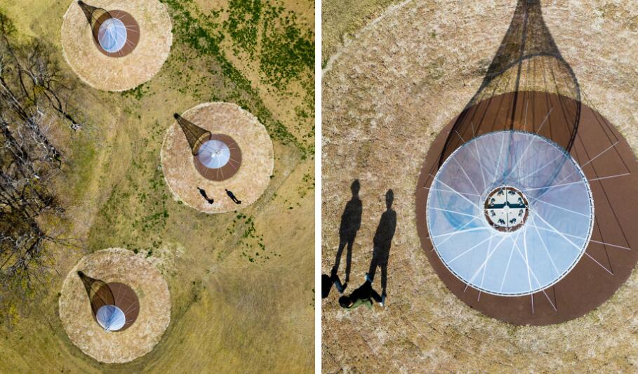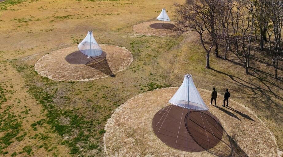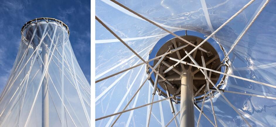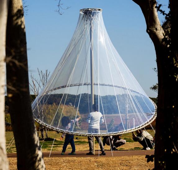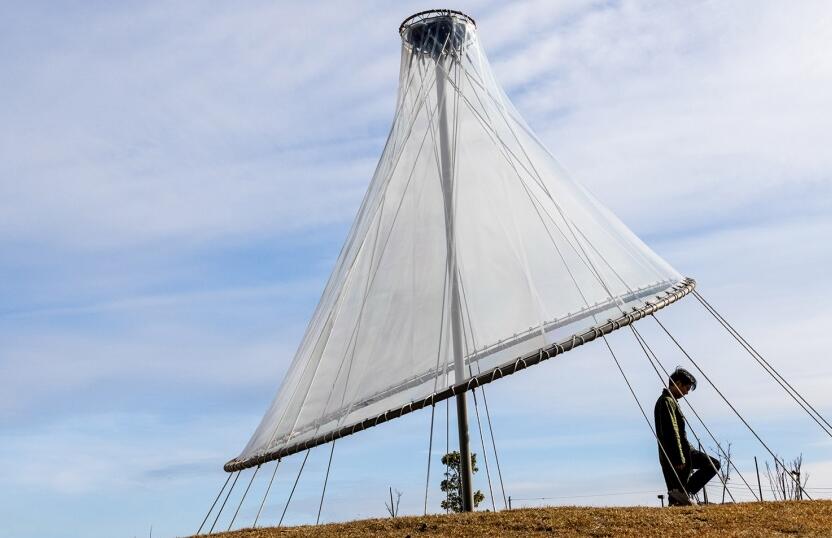 一根偏離于圓心的豎桿將碳纖維繩索呈輻射狀編織到地面,由此設(shè)計出倒置的漏斗形狀。碳纖維繩上方覆蓋著ETFE(四氟乙烯)材質(zhì)的透明且柔軟的“帽子”,這些現(xiàn)代材料創(chuàng)造出了一個具有原始感的輕型構(gòu)筑物。