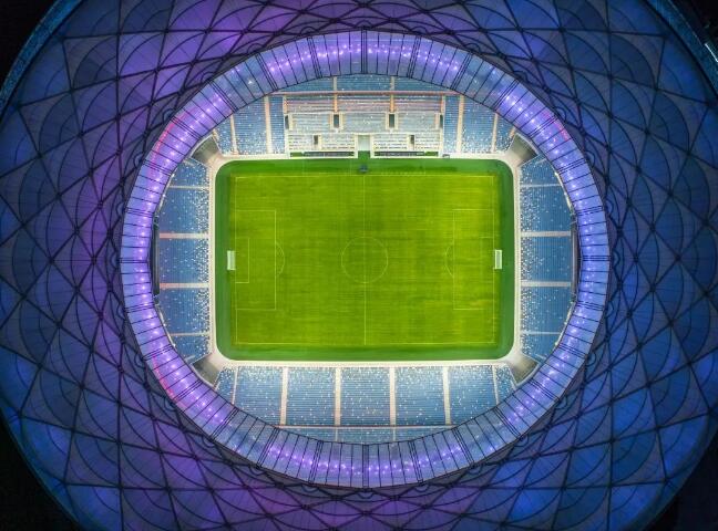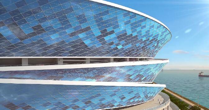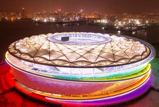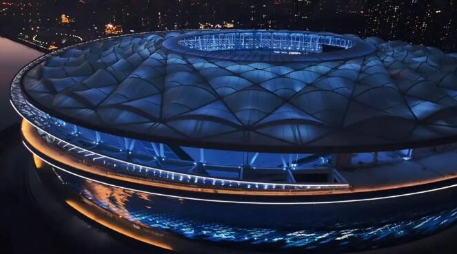 項(xiàng)目屋面由約4萬平方米PTFE膜打造成波浪造型,外立面由ETFE索膜結(jié)構(gòu),與環(huán)繞索膜泛光照明體系組成。其中,外立面使用的ETFE膜包含9種藍(lán)色膜材、7823片膜片,是目前世界上專業(yè)足球場膜結(jié)構(gòu)覆蓋面積最大,采用單層ETFE膜結(jié)構(gòu)最多的工程。