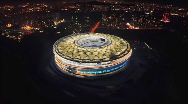 夜晚亮燈后整個球場流光溢彩、絢麗璀璨,燈光系統(tǒng)通過復(fù)雜而有規(guī)律的排布形成層次感,彰顯浪漫的海濱色調(diào),呈現(xiàn)一場唯美浪漫的視覺盛宴。