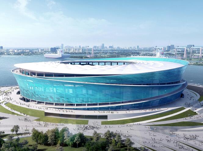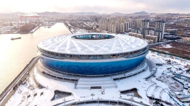 項(xiàng)目設(shè)計靈感來源于“海浪與海螺”,設(shè)計理念為“炫彩疊浪”,建筑立面呈“海洋藍(lán)”,頂棚呈白色,“藍(lán)海白云”與飾面象征波光粼粼的水之形態(tài),將大連的海洋文化、足球精神融于一體。
