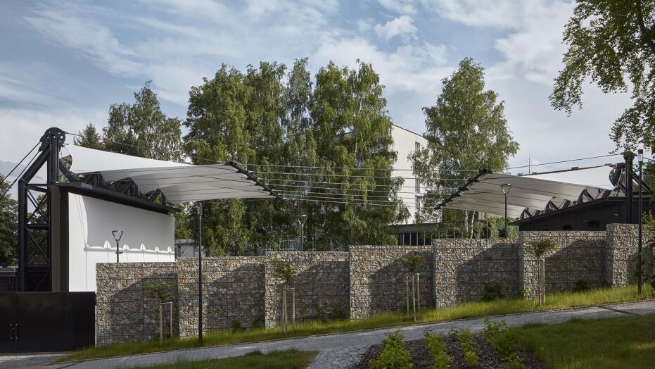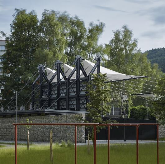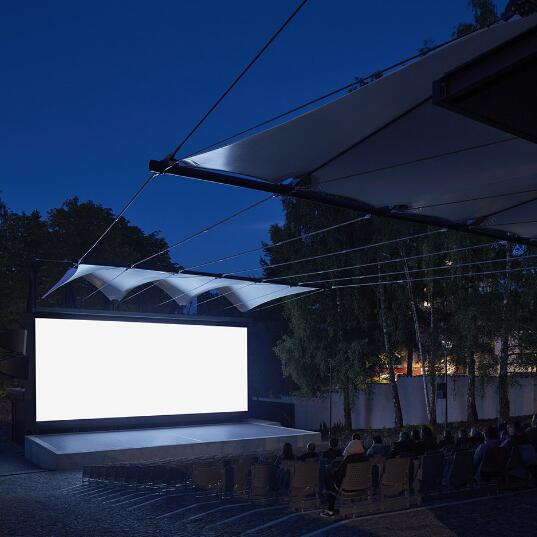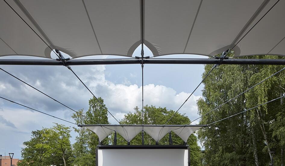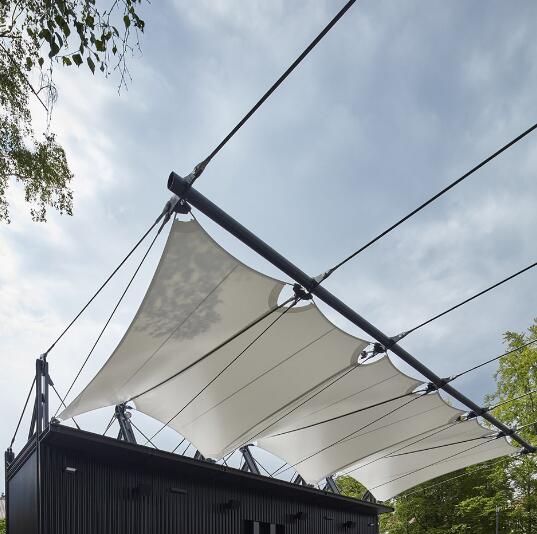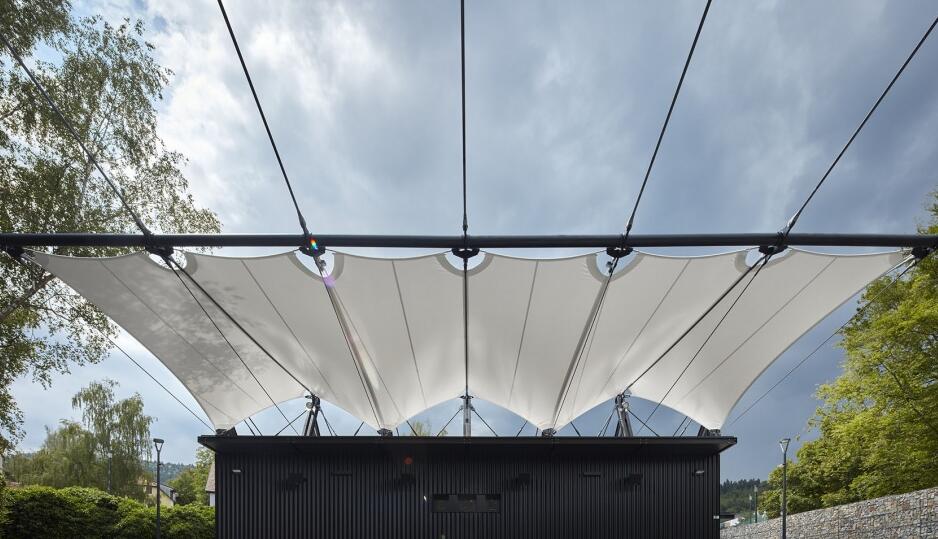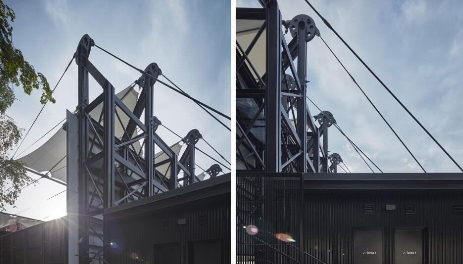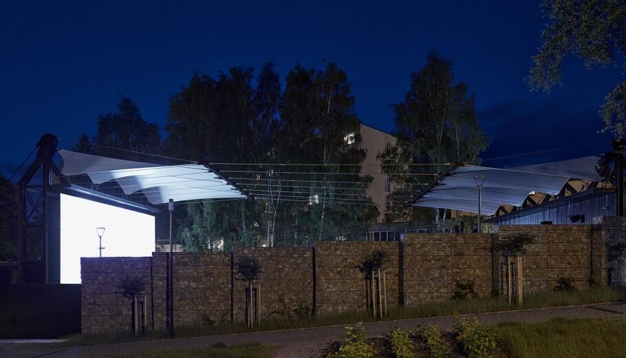 無(wú)論是晴朗的午后還是雨夜,舞臺(tái)和觀眾席上方的織物膜材屋頂不僅能提高演員和觀眾的舒適度,還能提升影院劇場(chǎng)的聲學(xué)特性。采用張拉膜結(jié)構(gòu)屋頂解決方案的目的是最大限度地減輕建筑的重量,考慮到建筑的高自由度,增加了額外的支撐元素。繩索的鋼結(jié)構(gòu)支撐不僅是功能和技術(shù)元素,也是美學(xué)元素。