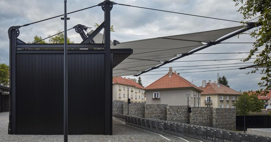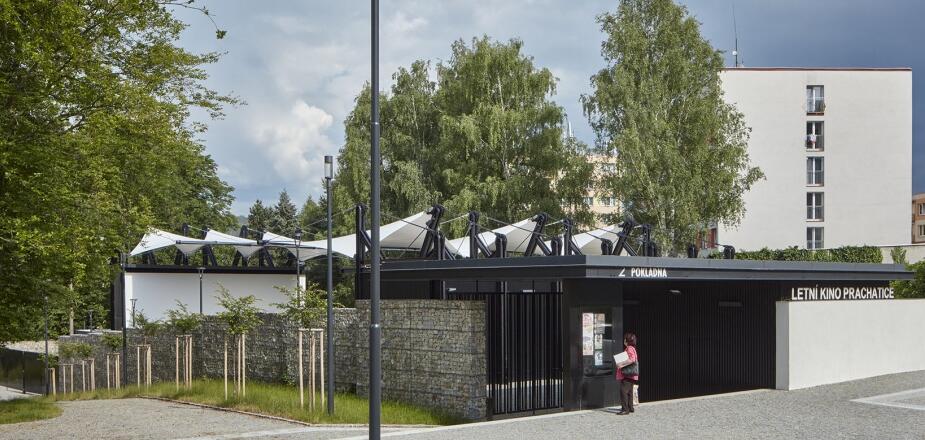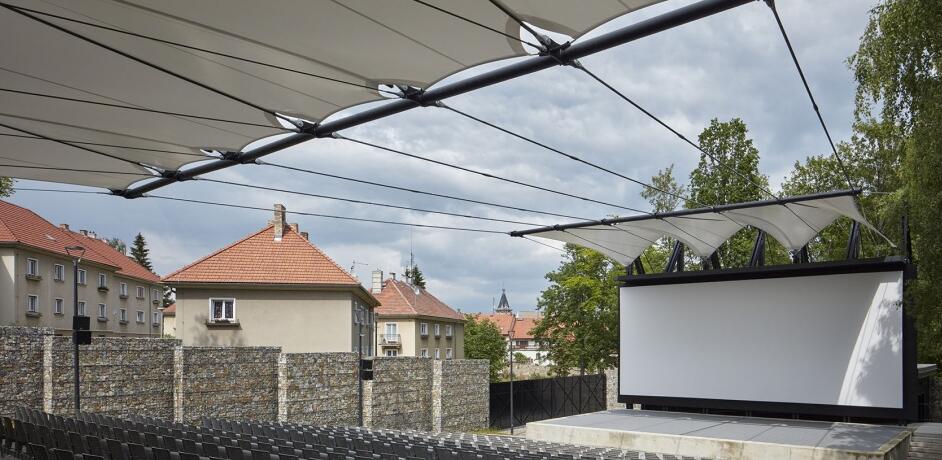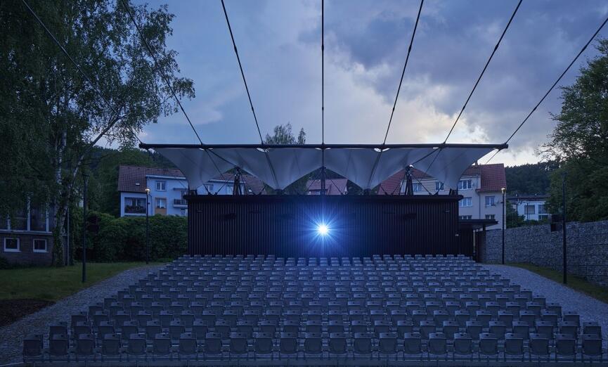 捷克.普拉哈季采,這是一座荒廢露天電影院的改造案例,設(shè)計(jì)理念來(lái)自于多季節(jié)使用的需求及電影膠卷的靈感。依據(jù)電影放映機(jī)中的膠片卷軸系統(tǒng),結(jié)構(gòu)的設(shè)計(jì)轉(zhuǎn)化為控制屋頂?shù)睦?。屋頂?shù)姆浪げ?,精巧的鋼結(jié)構(gòu)和波紋鋼板創(chuàng)造了光的錯(cuò)覺(jué)。