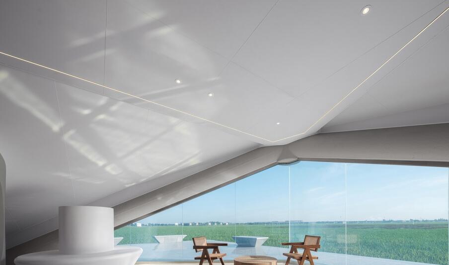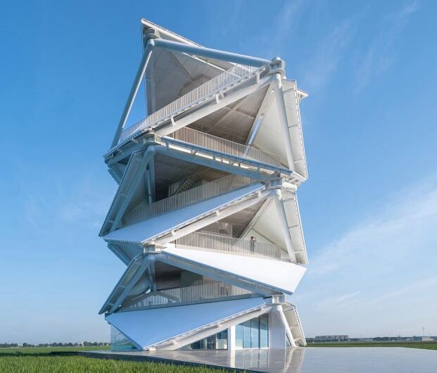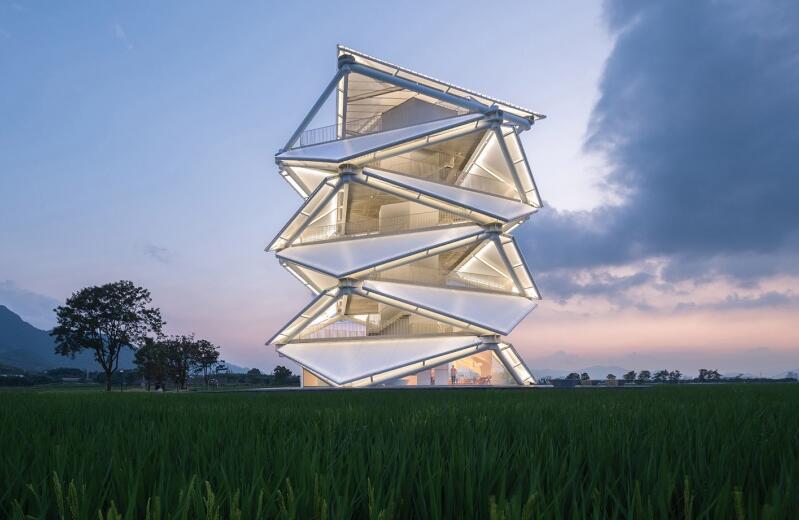 設(shè)計(jì)的靈感來(lái)源于對(duì)成熟稻穗的抽象表達(dá),以統(tǒng)一的三角形為母題完成了整個(gè)構(gòu)筑物的形式和結(jié)構(gòu),并在垂直高度上變化、旋轉(zhuǎn)和重構(gòu)。
