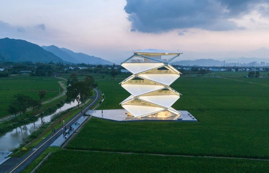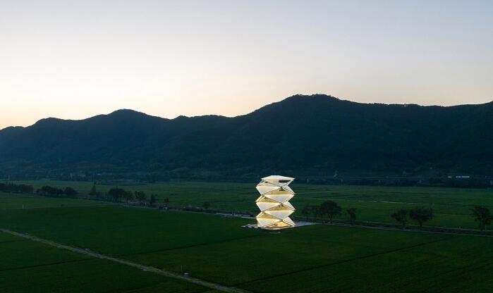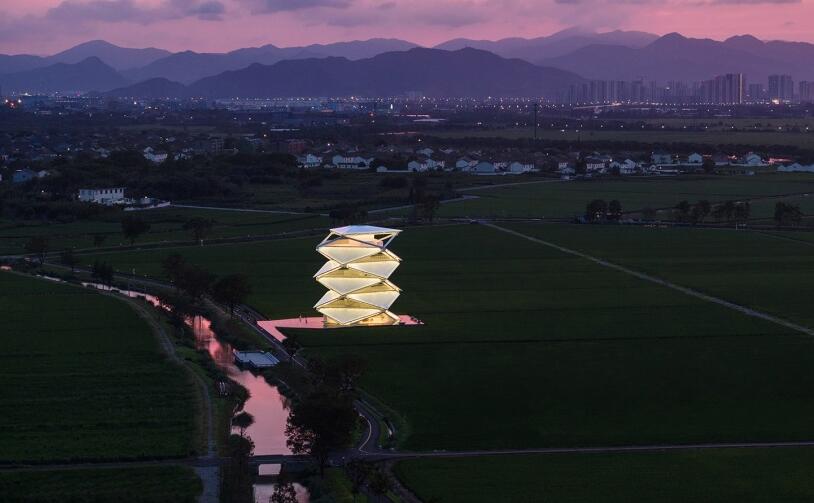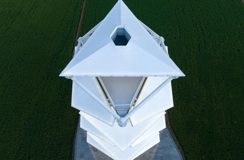 稻田上的燈塔作為寧波奉化區(qū)西塢街道 “萬(wàn)畝方”項(xiàng)目最有標(biāo)志性的構(gòu)筑物,它的落成為當(dāng)?shù)氐泥l(xiāng)村提供了新的觀景點(diǎn)和社交聚集地。瞭望塔塔高23m,坐落于國(guó)家級(jí)現(xiàn)代農(nóng)業(yè)先行示范區(qū)高標(biāo)準(zhǔn)農(nóng)田的中心區(qū)域。它如同雕塑一般從稻田中螺旋升起,三角形元素和白色膜材定義了其簡(jiǎn)潔的設(shè)計(jì)語(yǔ)言,在鄉(xiāng)村大地上賦予了其強(qiáng)烈的存在感。