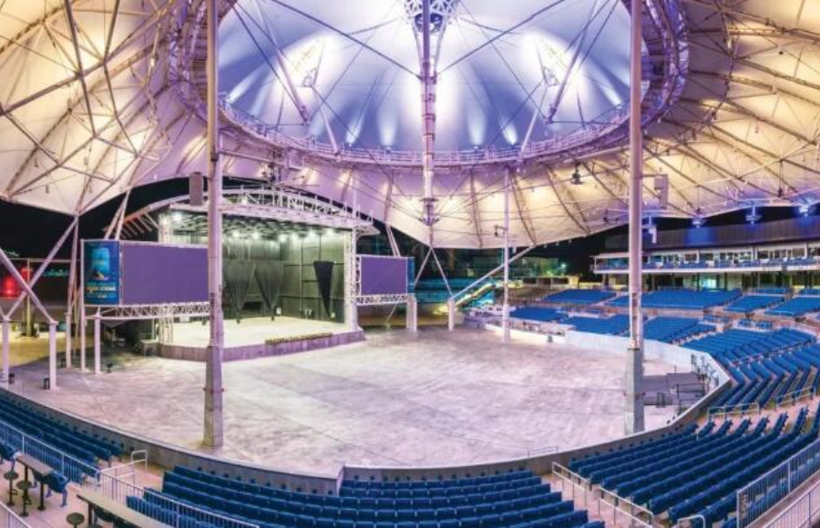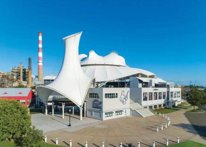 哈特福特市醫(yī)療保健機(jī)構(gòu)圓形劇場(chǎng)采用反光的PTFE膜材。在穹頂桅桿接觸屋頂織物的部位,F(xiàn)TL使用ETFE膜材以獲取更多的光線射入。同時(shí),在穹頂和下部圍護(hù)結(jié)構(gòu)之間采用黑色網(wǎng)格膜提供被動(dòng)散熱能力。