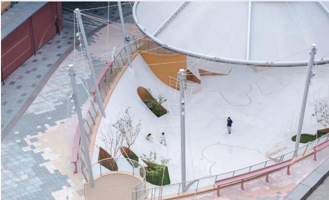 “浮庭”由上方如同水母般漂浮的半透明織物膜結(jié)構(gòu)與下方懸浮感的地景花園共同組成。膜結(jié)構(gòu)既成為了廣場(chǎng)的頂蓋,形成包覆與洞天的感受,也作為織連體引導(dǎo)主要流線銜接了室外幾個(gè)重要節(jié)點(diǎn)。結(jié)合原混凝土柱的加寬基礎(chǔ)上支起鋼柱,以懸吊與支承合作的形式將膜結(jié)構(gòu)撐起,減少了廣場(chǎng)中結(jié)構(gòu)的出現(xiàn)。