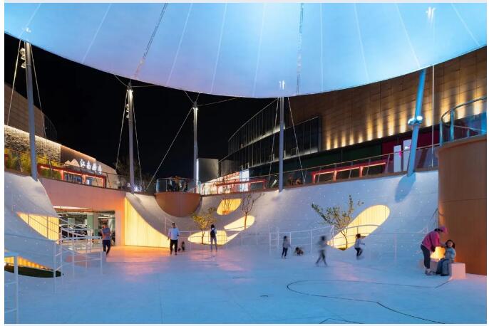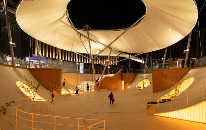 輕盈的木紋透光玻璃表達(dá)的立面與面層邊緣,使得整個(gè)水洗石面層在夜晚如同從地面掀起的薄殼。配合種植池中設(shè)置的投影與柱體上的燈光,膜結(jié)構(gòu)的表面成為了光影的接受器,場(chǎng)地中光的元素相互配合,消減了原有的物質(zhì)材料性,營(yíng)造出沉浸式的互動(dòng)光影藝術(shù)情境,令這一地下入口廣場(chǎng)空間成為日落之后的重點(diǎn)氛圍舞臺(tái)。
