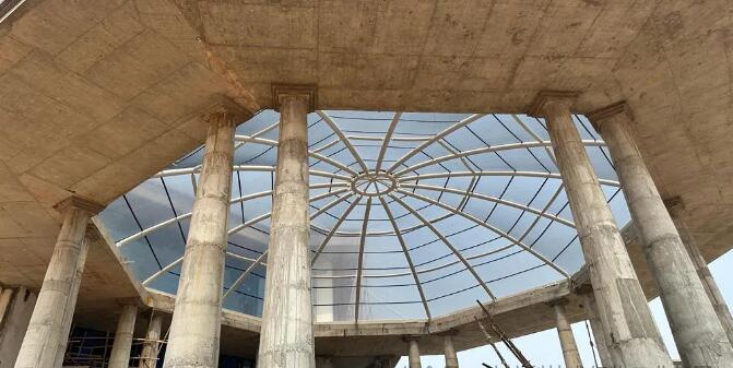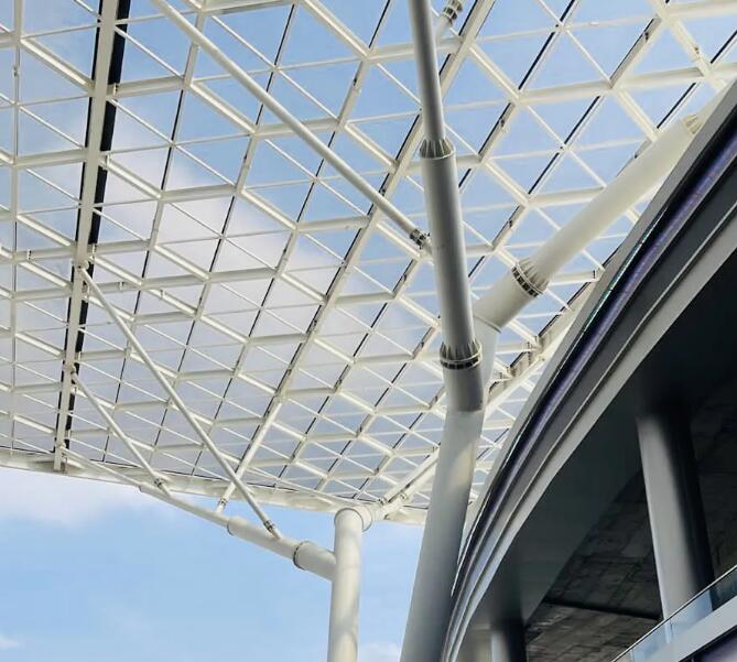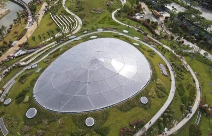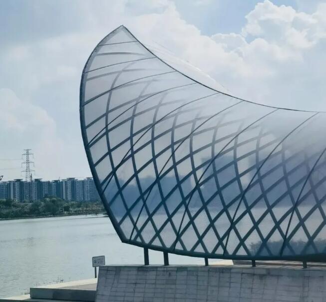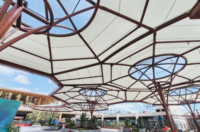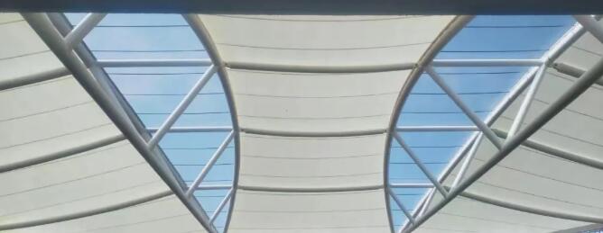 STFE膜是在高韌度聚芳酯纖維網(wǎng)格上進(jìn)行特種含氟聚合物透明膜覆膜而成的新型高透光膜材,是一款真材實(shí)料的“軟玻璃”;STFE膜材單方重量為900g,不到1kg/m2(一般中空lowE玻璃重量為30kg/m2左右),可大面積張拉,結(jié)構(gòu)輕盈又百分百防水。與此同時(shí)STFE膜又具有高透光且高透景的特點(diǎn),適用于需要自然采光和合適紫外線照射的動(dòng)植物園,陽光房,體育場(chǎng),以及需要透光且透明的公共建筑(如交通通道,購(gòu)物中心,天幕,中庭等),是應(yīng)用越來越多的新型膜結(jié)構(gòu)材料。