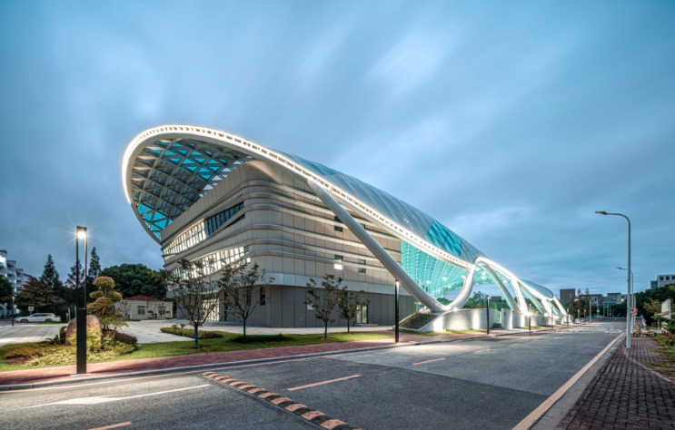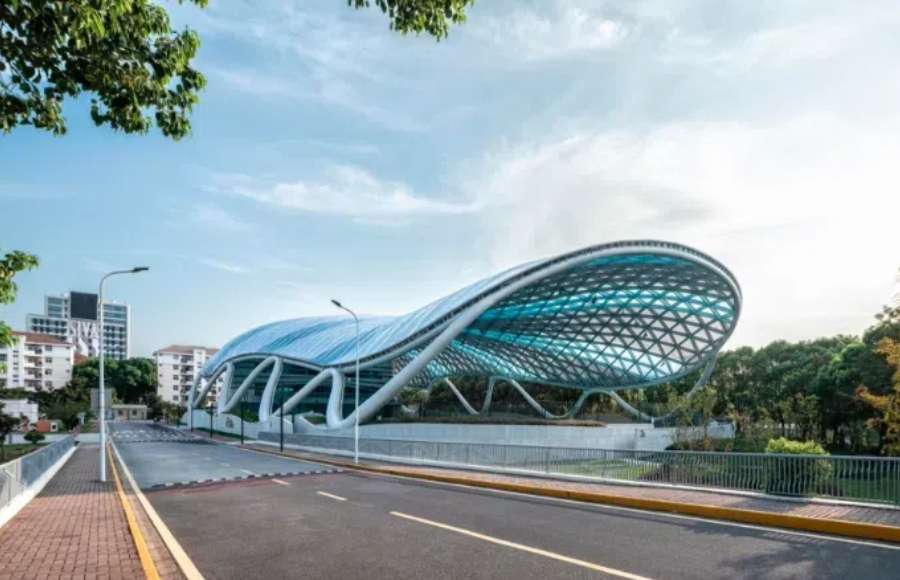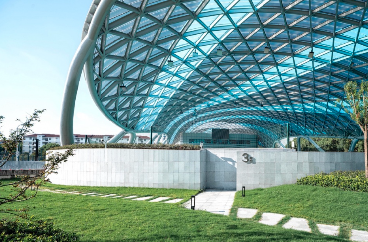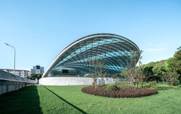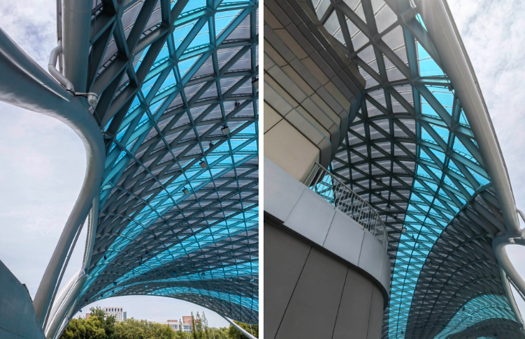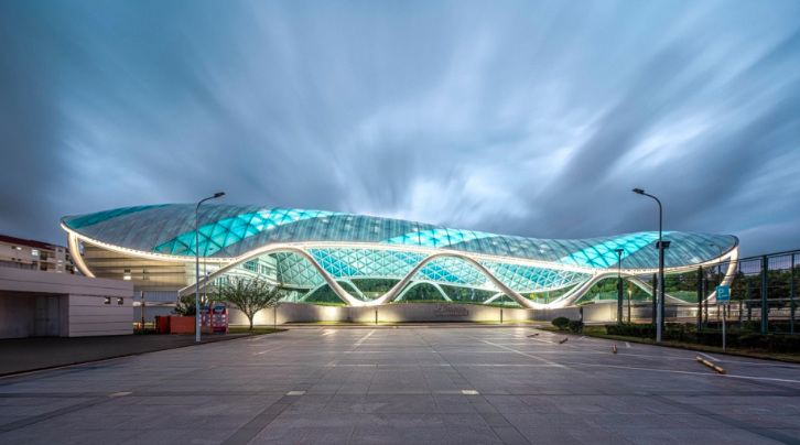 弧形屋面由單層 ETFE張拉膜包裹金屬骨架形成,骨架由簡潔的三角元素拼合而成。從內(nèi)部看,富有節(jié)奏和律動的變化,產(chǎn)生了韻律之美。在膜材的選擇過程中,特意選取藍(lán)、白兩種顏色以及不同透明度的膜材,按照金屬鋼骨架的結(jié)構(gòu)走向進(jìn)行間隔搭配布置,呈現(xiàn)出跳躍般的變化?;⌒蔚谋砻娣瓷涑鲋車h(huán)境,模糊了屋頂與天空的界線。建筑兩個長邊采用了波浪狀的飄帶鋼柱展現(xiàn)出柔中有剛的力量感,實現(xiàn)了結(jié)構(gòu)成就建筑之美的理念。