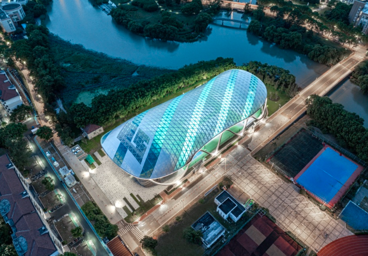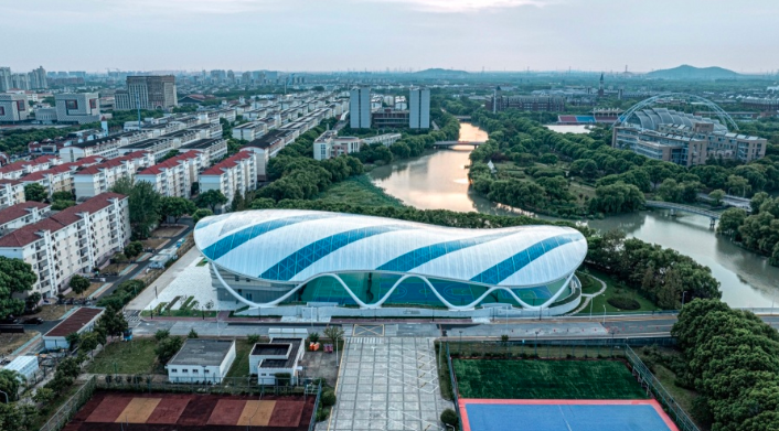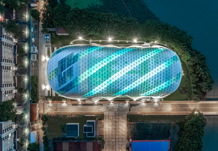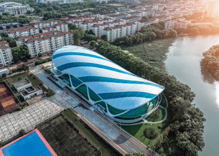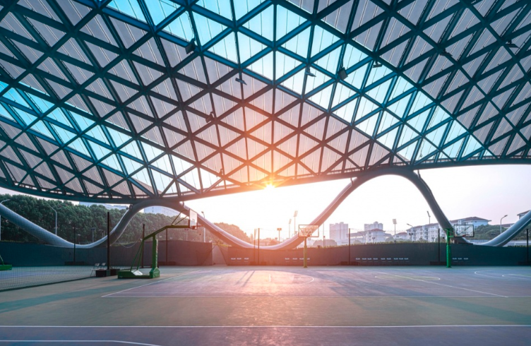 風(fēng)雨操場屋面隨形體起伏,建筑高度呈彈性變化,與運動場地有機融合,最終呈現(xiàn)的弧形屋頂營造出豐富絢麗的第五立面效果。半圍合的結(jié)構(gòu)形式為風(fēng)雨操場賦予了更為人性化的開闊尺度。通透靈動的形態(tài)不僅有利于通風(fēng)和采光,還使外立面形體獲得更多自由,并降低了建設(shè)成本。