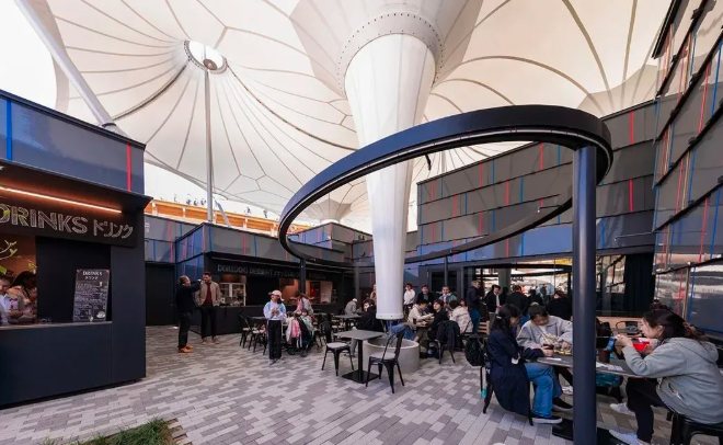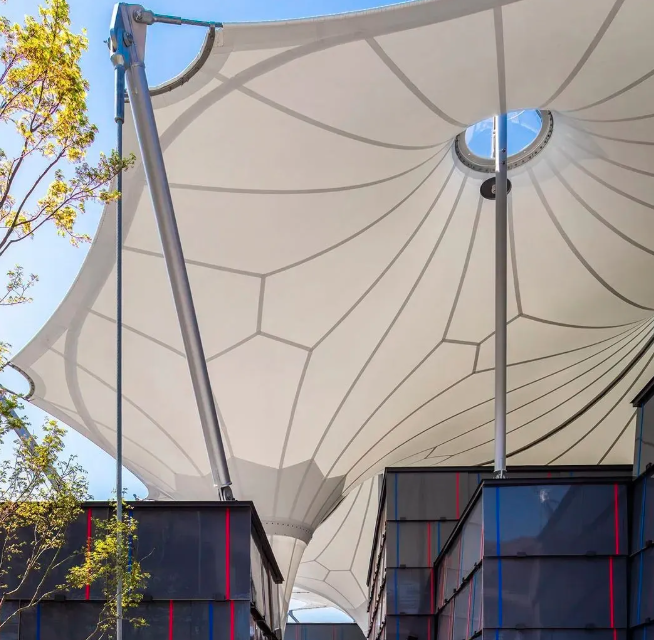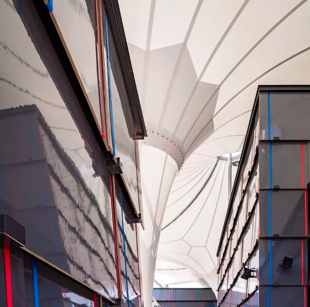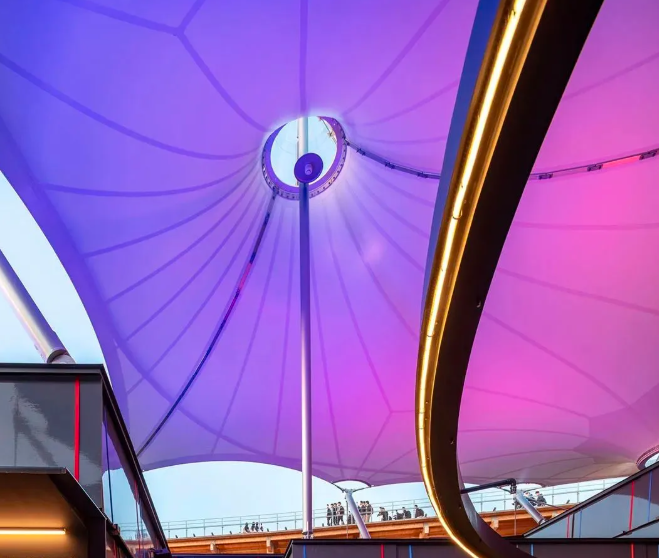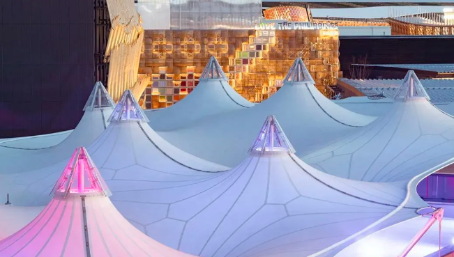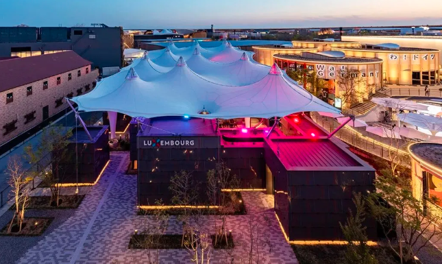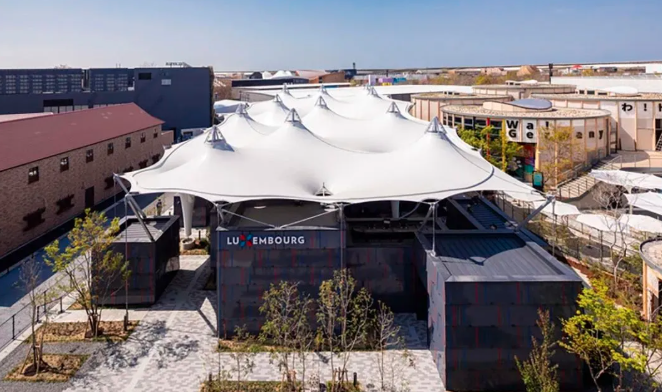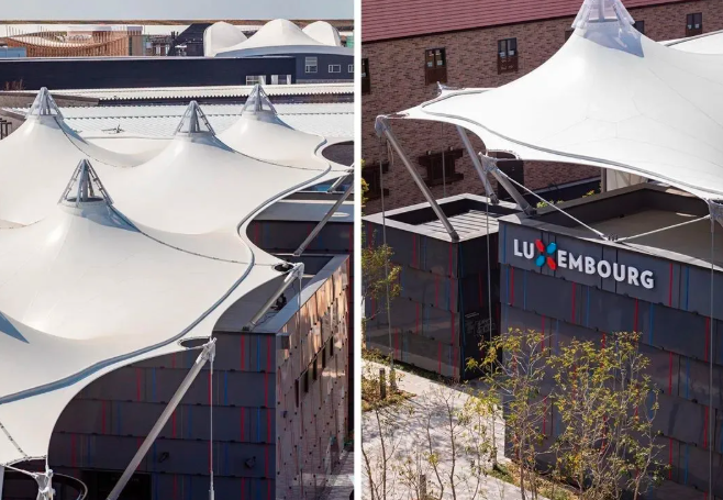 建筑由三個特色元素組成,與2025年世博會的三個主題相對應(yīng):“設(shè)計未來社會”,這是博覽會的總主題,代表著人們共同擁有的獨一無二的東西,人們共享同一個地球,該理念由覆蓋展館的一整個膜結(jié)構(gòu)大屋頂代表,代表這是盧森堡國家的項目,它的輻射力和傳播力可以超越國界。