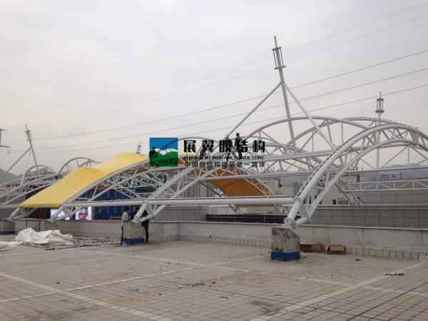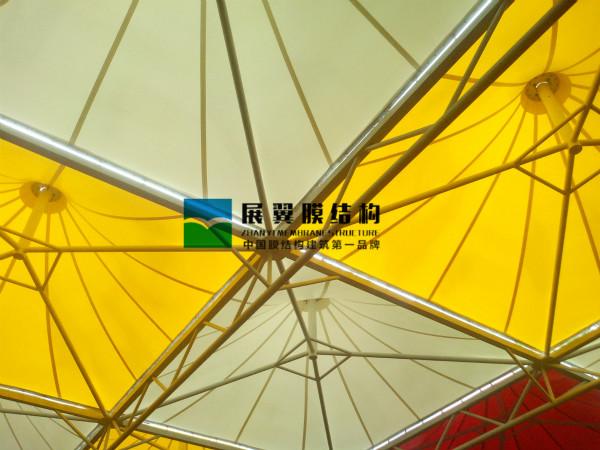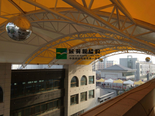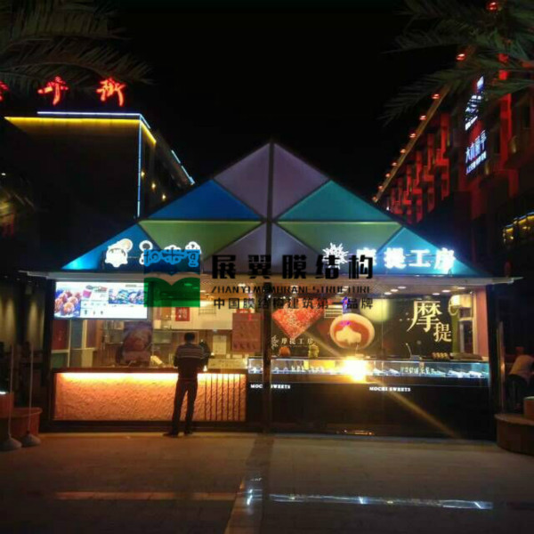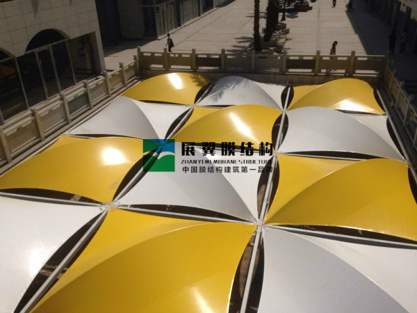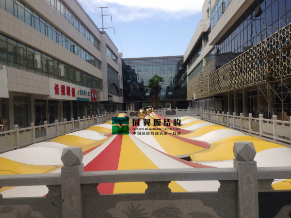 蘭州金牛街膜結(jié)構(gòu)工程全系列包括膜結(jié)構(gòu)天井、膜結(jié)構(gòu)屋頂遮陽棚、膜結(jié)構(gòu)天橋通道遮陽棚、啤酒屋膜結(jié)構(gòu)屋頂、特殊膜材玻璃房等等、工程全部采用彩色膜材搭配建造,造型設(shè)計(jì)別出心裁。這些張拉膜建筑不但具備強(qiáng)大的實(shí)用功能,同時(shí)也成為了商業(yè)街一大觀賞亮點(diǎn)。