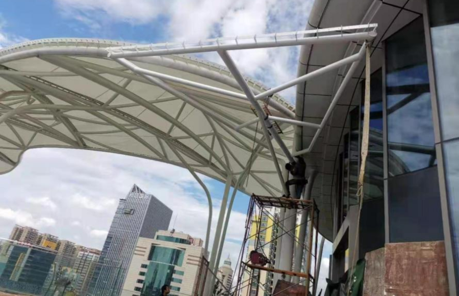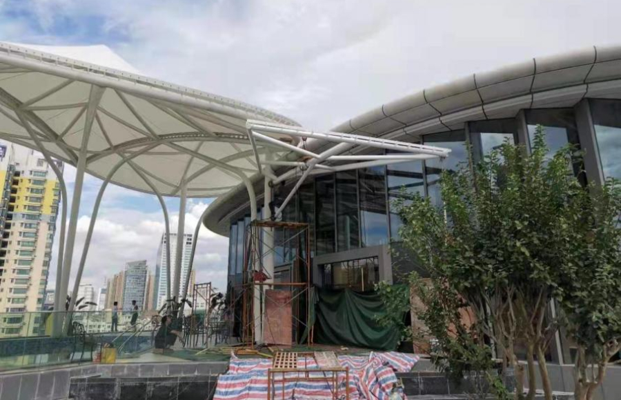 佛山雄盛王府屋頂泳池膜結(jié)構(gòu)頂棚工程近日基本完工,工程采用PTFE膜材,目前工人正進(jìn)行最后完善工作。