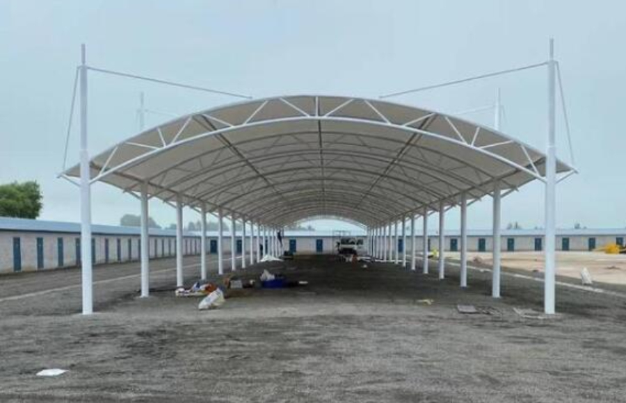 廣東茂名經(jīng)開區(qū)廠房張拉膜結(jié)構(gòu)停車棚工程基本完工,車棚設(shè)計為拱形屋面式棚頂,鋼結(jié)構(gòu)支撐。工程現(xiàn)進行最后調(diào)節(jié)及清潔工作。