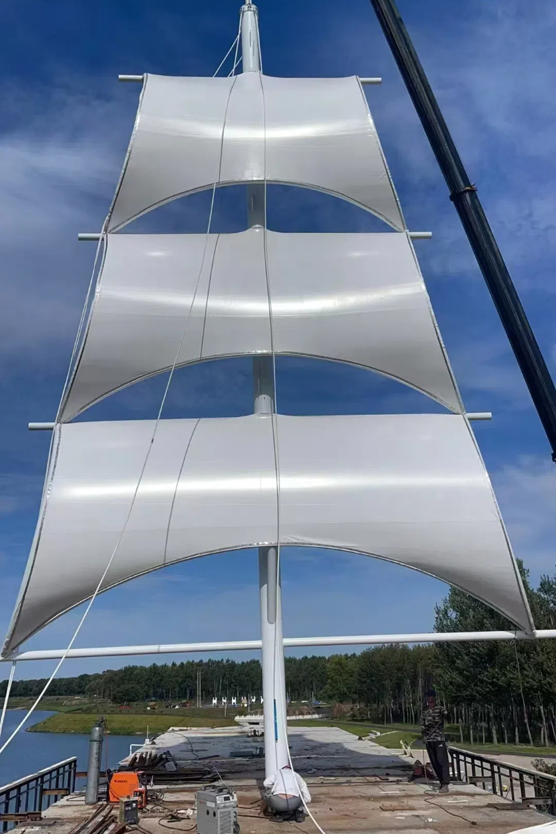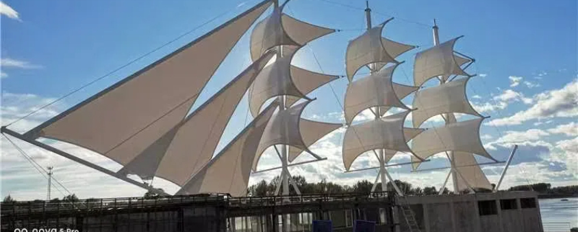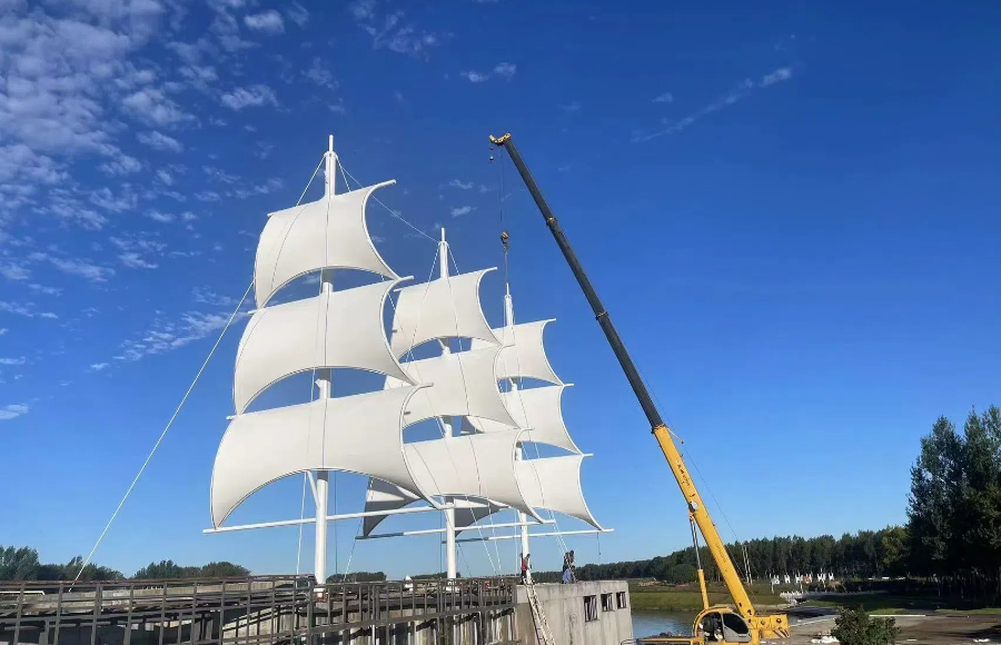 黑龍江省鐵力市景觀膜結(jié)構(gòu)工程“風(fēng)帆”已接近完工,工程以“風(fēng)帆”為靈感設(shè)計(jì)了一組景觀裝置,豎起的鋼管桅桿,膜材張拉出風(fēng)帆形狀,似一艘巨輪揚(yáng)帆啟航。
