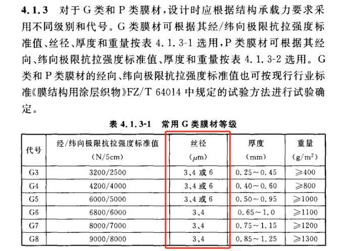《膜結(jié)構(gòu)技術(shù)規(guī)程》CECS 158 里對G類膜材(也就是在玻璃纖維基材上涂覆PTFE的一大類膜材)的強(qiáng)度等級進(jìn)行了劃分,分為G3~G8六個等級。