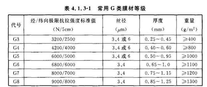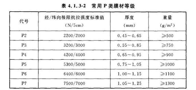 《膜結(jié)構(gòu)技術(shù)規(guī)程》CECS 158 從結(jié)構(gòu)設(shè)計角度,給出了膜材的極限抗拉強度標(biāo)準(zhǔn)值,如表4.1.3所示。