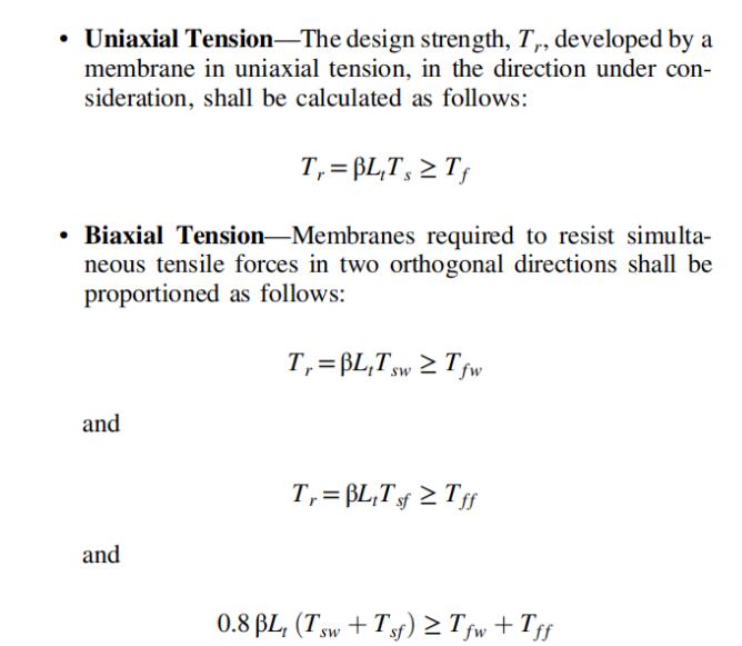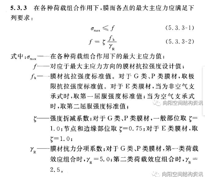 另外,美國規(guī)程不僅分別驗算了膜材經(jīng)向和緯向強度,還驗算了經(jīng)緯向的組合強度。但膜面的經(jīng)緯向應(yīng)力一般不會同時最大,所以通常不是控制情況。